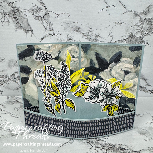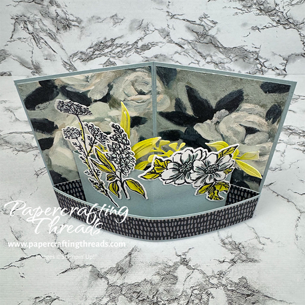 Adhere the two rose-patterned pieces (from the Beautiful Gallery 6″x6″ DSP) so the image flows continuously across the separation by the scoreline. Fold the tab ends of the Cloud Cover bendi strip under. Adhere the long strip of the hatch pattern on the front. With the bendi strip face up and the tabs folded back, adhere the short strips of the hatch patterned paper face up on each tab. Then add liquid glue to the backs of the tabs and the extension of patterned paper and adhere along bottom front of card base, leaving a small gap from the bottom edge.