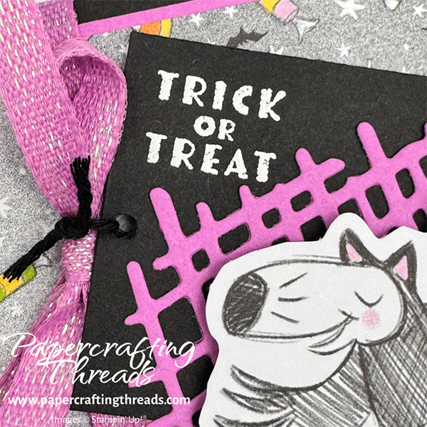 Stamp the sentiment in Versarmark ink on the rectangle of Basic Black cardstock. Heat set with white WOW embossing powder. Diecut the hatch pattern from the Perfectly Pears die set out of the scrap of Petunia Pop cardstock. Dot with liquid glue on the back and adhere to the black tag at an angle. Press the trick or treater out of the die cut sheet from Spooky Sweet paper pack, pop up on Dimensionals and add to tag. Punch an ⅛” hole on the left side of the tag, thread a length of black baker’s twine through the hole and tie in a knot around the Petunia Pop bow.