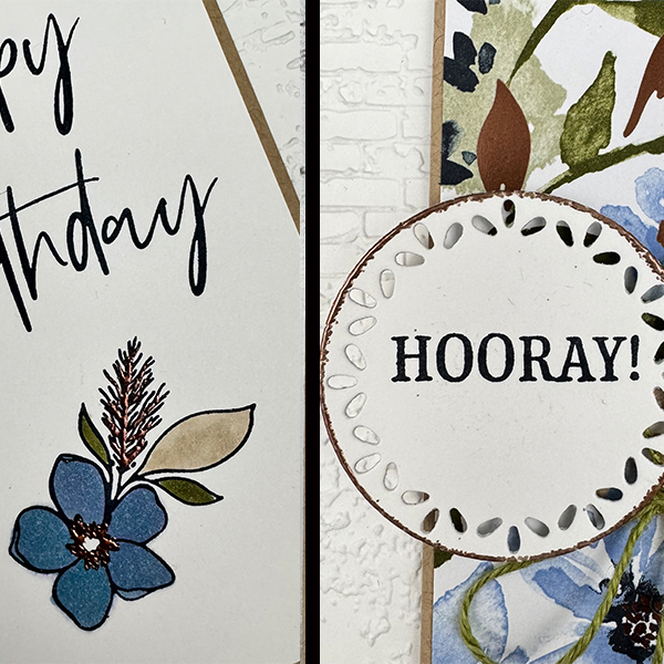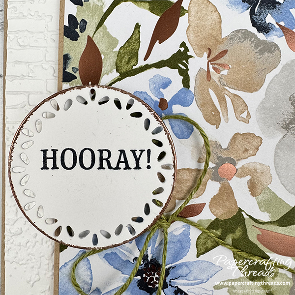 To add a shiny border of embossing powder, I stamped ‘HOORAY’ in Secret Sea on a scrap of Basic White and die cut it with the 1⅝” circle from the Spotlight on Nature die set. Then, holding the circle in the middle with my fingertips, I rolled the edges of the circle directly on a Versamark ink pad. Next I sprinkled copper embossing over the circle and used a dry paintbrush to remove any excess powder in the middle where my fingers had been. And then heat set.