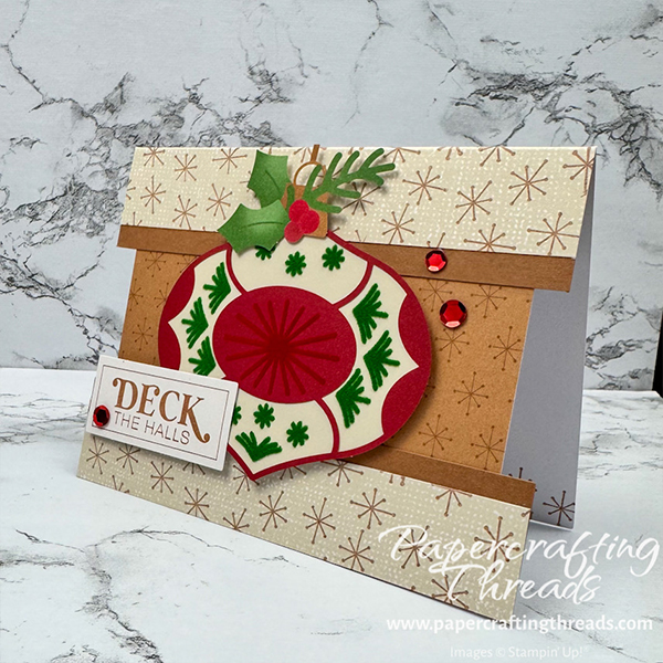 Adhere one of the Pecan Pie strips behind the 1″ Basic Beige linen-pattern strip. Adhere the other Pecan Pie strip behind the 1″ flap of the card front. I used liquid glue so I had time to reposition. Glue the red die cut bauble from the kit to the top of the Basic Beige/green flocked bauble.