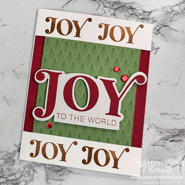 Stamp the word ‘JOY’ in Pecan Pie ink twice along the top flap and then the bottom flap as shown. Stamp ‘TO THE WORLD’ along the bottom of the die cut JOY from the kit. Fussy cut the red flocking away from the words.