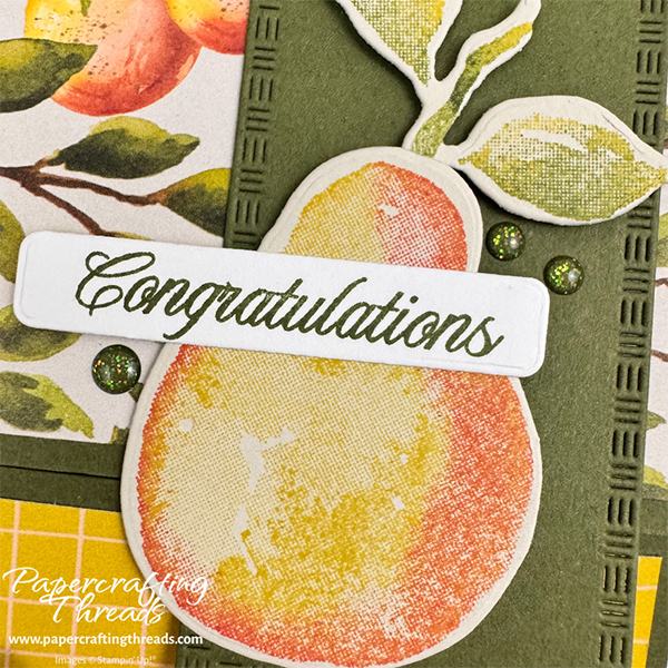 Add a Stampin’ Dimensional to the back left side of the greeting. Then add Stampin’ Seal to the other half. Place the greeting over the neck of the pear and off the side a bit.