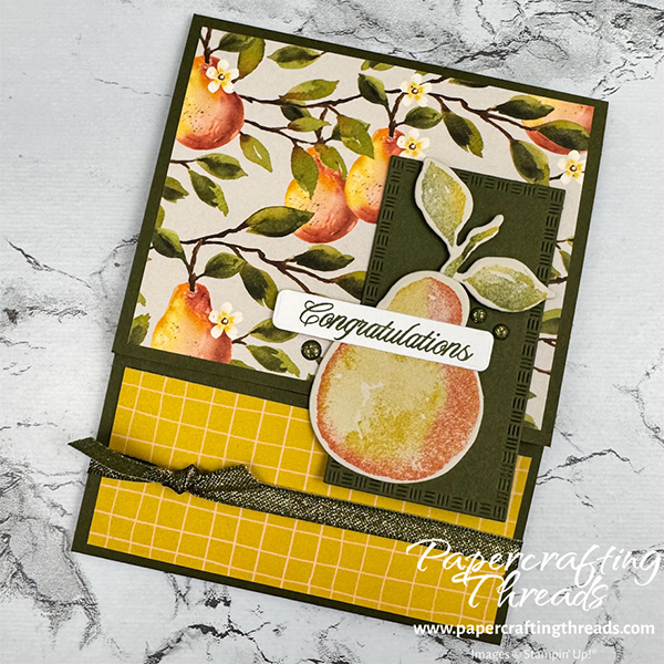 Add Stampin’ Seal to the back of the die cut pear. Adhere the leaves to the top. Add Stampin’ Dimensionals to the back of just the top of the pear and the leaves. Adhere off center and at an angle to the die cut Mossy Meadow rectangle. Add Stampin’ Seal to the top back of the rectangle and adhere to the top flap of the card, leaving the bottom free and unattached.
