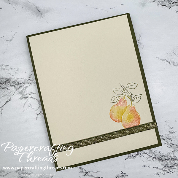 Ink the small set of pears with Darling Duckling ink. Use sponge daubers to add Mossy Meadow to the leaf portion and then Strawberry Slush to the pear bodies. Stamp about an inch from the bottom right corner of the Basic Beige cardstock liner.