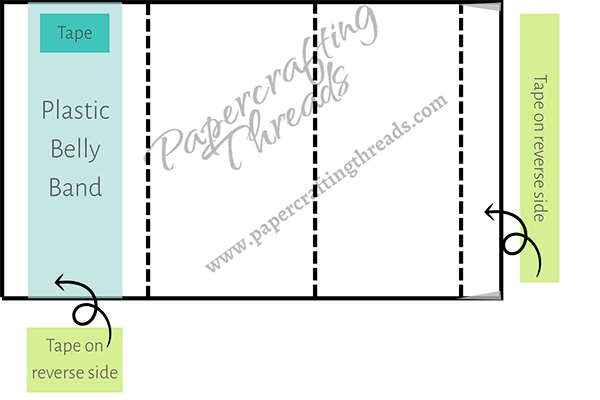 With the remaining piece of Pecan Pie cardstock cut and scored as noted, miter the edges of the ⅜” tab. Working with the 1½” panel on the left and the tab on the right, position a strip of plastic (cut from a sheet protector or plastic baggie or even a grocery bag) that is ⅞” wide and at least 6½ long at the top edge of the panel. Add a piece of Tear & Tape at the top edge of the plastic, taking care not to extend past the plastic in any direction. Holding the plastic with one hand and the cardstock in the other, wrap the plastic strip around the panel like a belly band and secure the end of the plastic to itself. Trim any excess close to the Tear & Tape.