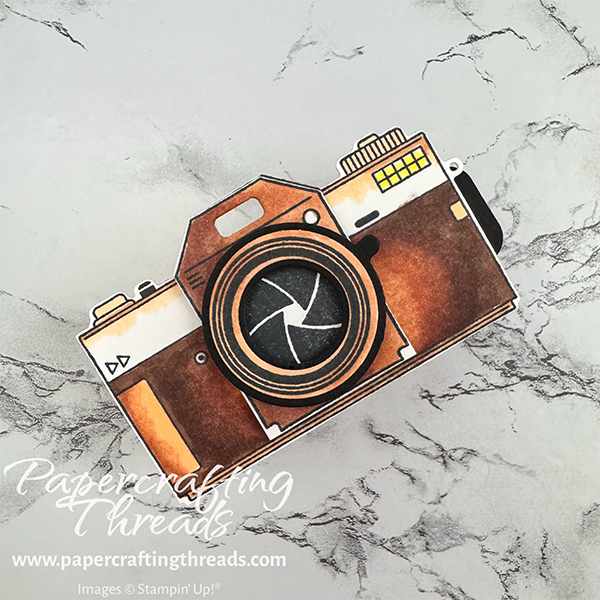 Start with the Capturing Smiles stamp set (& matching dies) by stamping the camera images in Tuxedo Black Memento ink on a scrap of Basic White cardstock. Color in the images with Stampin’ Blends – I used SU200, SU400, SU600, and SU900 for the shades of brown. I also used just a touch of Dark Lemon Lolly and the Color Lifter to soften one of the edges.