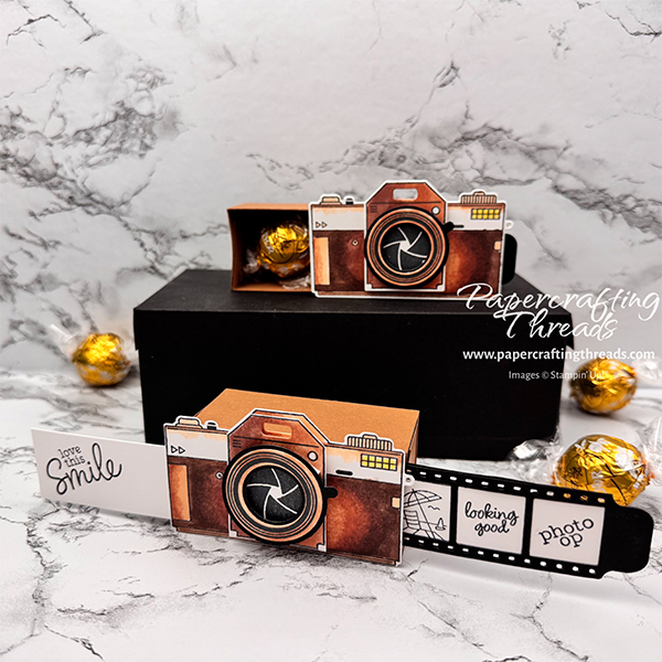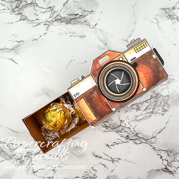 A Matchbox Double Slider Camera is shown. Brown stamped and die cut camera images adhered together to create a realistic 3D camera attached to a brown matchbox drawer that holds chocolate truffles. Camera is shown with the hidden drawer open and filled with truffles.