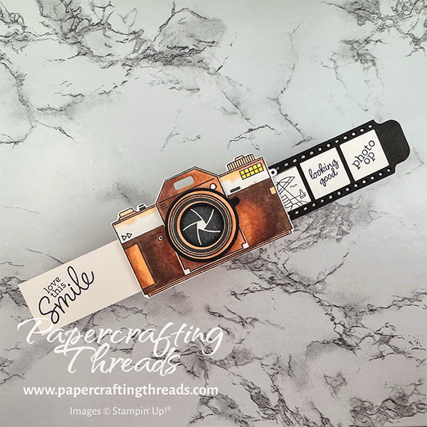 A Matchbox Double Slider Camera is shown. Brown stamped and die cut camera images adhered together to create a realistic 3D camera attached to a brown matchbox drawer. The secret messages are revealed on each side. Greeting of 'love this smile' extends on white strip to the left. Film strip extends to the right with three cells, 'photo op', 'looking good' and a beach scene.