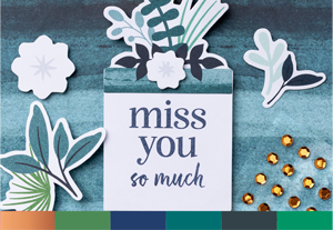 Show your love and appreciation with rich watercolor hues and elegant botanical flourishes. Makes 9 cards: 3 each of 3 designs with 9 coordinating envelopes. Features copper foil and copper sequins, precut paper and vellum pieces. Coordinating colors: Night of Navy (Classic Stampin’ Spot), Copper, Garden Green, Pretty Peacock, Secret Sea, and Shaded Spruce.