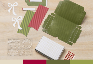 Craft festive goody boxes perfect for holding gift cards or small treats! Makes 8 projects: 4 each of 2 tag designs with 8 identical coordinating boxes. Features foldable box bases and precut paper pieces, linen thread and red dot embellishments. Coordinating colors: Mossy Meadow (Classic Stampin’ Spot), Basic Beige, Cherry Cobbler, and Old Olive.