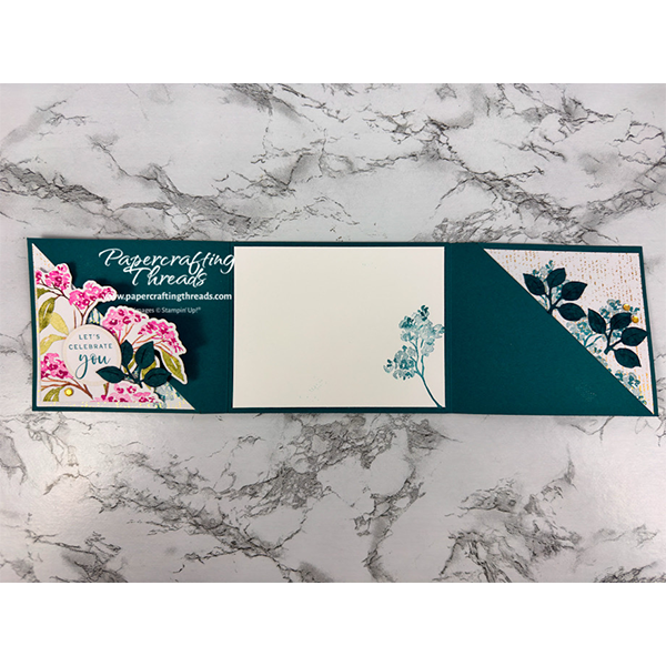 This Swivel Fun Fold Card has a little surprise up its sleeve! It looks like a regular portrait card, but with a slight twist, it transforms into landscape – it’s fascinating. I used my favorite Stampin’ Up! color Pretty Peacock as the base with a split layer of gorgeous gold foil speckles that catch the light. Delicate foliage creates the perfect backdrop, while vibrant pink florals and fresh green leaves sweep dramatically from one corner almost to the other. And because there’s no such thing as too much sparkle, I scattered gold sequins throughout for that extra touch of glamour. Let’s get started!